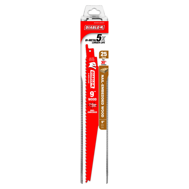 Les lames de scie alternative bimétalliques Diablo pour bois clouté sont spécialement conçues pour des performances optimales dans toutes les applications de pose brute. Ces lames hautes performances bénéficient d'une technologie bimétallique qui leur confère une durée de vie jusqu'à 5 fois supérieure à celle des lames standard, ainsi que d'un bord arqué Full Contact permettant des coupes plus rapides en moins de passages. La technologie brevetée de denture variable de Diablo assure des coupes plus nettes avec moins de vibrations, tandis que le revêtement antiadhésif Perma-SHIELD protège la lame de l'accumulation de chaleur, réduisant ainsi le gommage et la corrosion. La conception unique de la pointe permet une pénétration plus rapide et plus facile dans les matériaux les plus difficiles.
