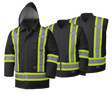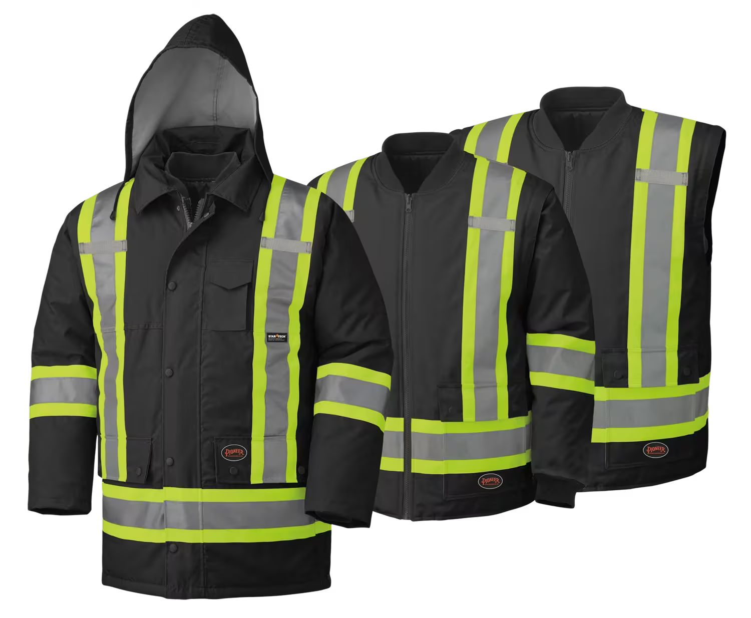 Parka de sécurité imperméable polyvalente 7-en-1 avec manches et capuche détachables et de nombreuses poches pour une fonctionnalité et polyvalence maximales.