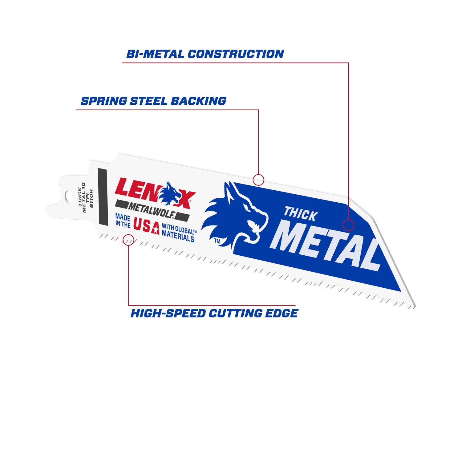 Lame de scie alternative Lenox® Lazer®, droite et résistante aux chocs, longueur 6 po, largeur 1 po, épaisseur 0,042 po, 10 TPI, dents brevetées/renforcées, soie 1/2 po, soie universelle/dentée, tranchant HSS-Co 8, corps en acier flexible, brillant, matériaux applicables : tuyaux noirs, barres d'armature et tiges d'acier