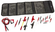 Sondes interchangeables pour un large éventail de tests. Compatibles avec la plupart des multimètres et oscilloscopes équipés de connecteurs standard de 4 mm. Le kit comprend des cordons de test banane de 4 mm de 109 cm de long avec connexions droites et coudées, des sondes de test, des sondes arrière longues, des sondes de test de sécurité, des pinces crocodiles, des adaptateurs femelle-femelle, des adaptateurs mâle-femelle, une petite pince crocodile avec adaptateur banane mâle et des adaptateurs à anneau fendu. Une pochette de rangement enroulable est incluse pour ranger les cordons et les adaptateurs.