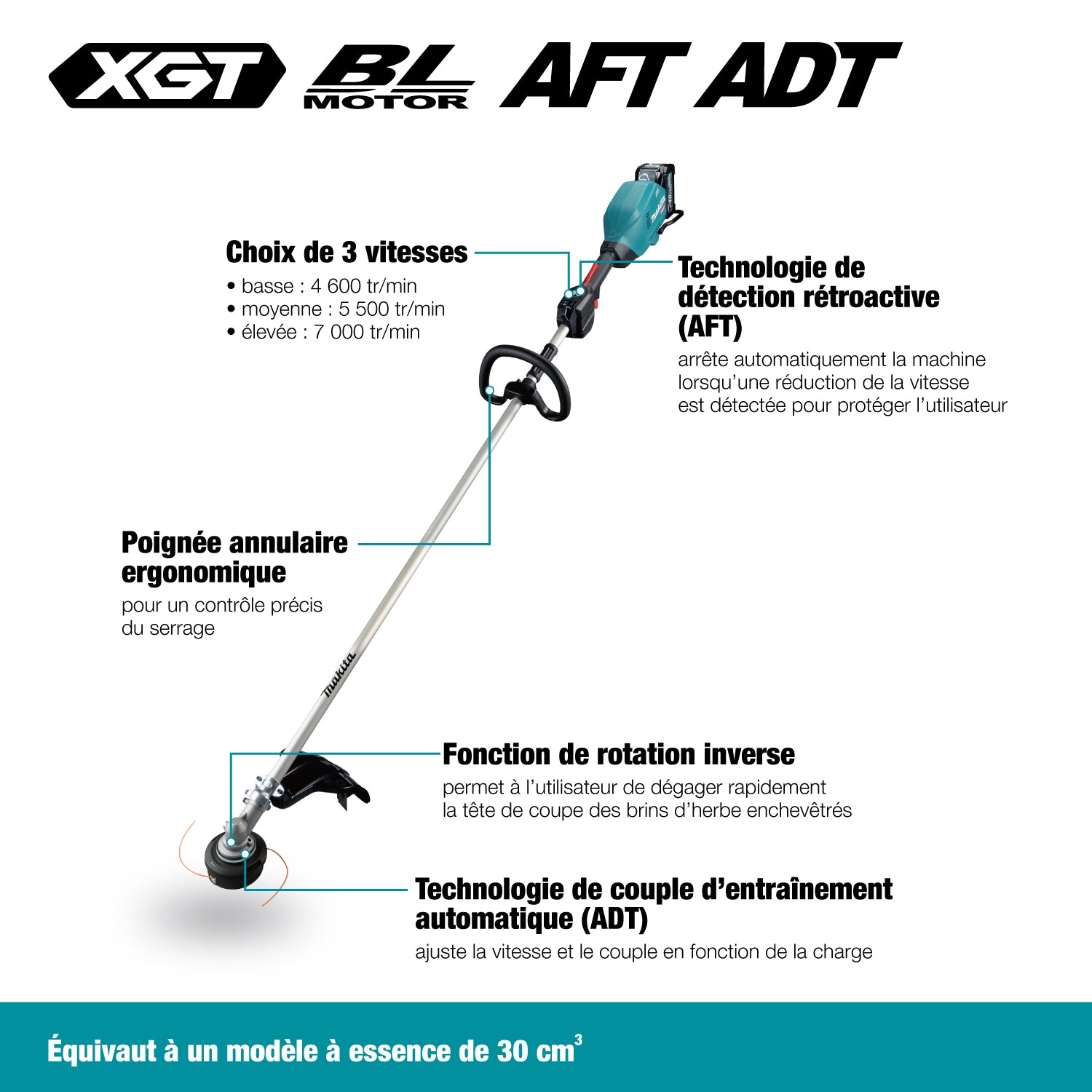 - Technologie d'entraînement de couple automatique (ADT) faisant automatiquement passer la vitesse de 3 500 à 5 500 tr/min pour une prolongation de la durée de fonctionnement ou une augmentation de la puissance
