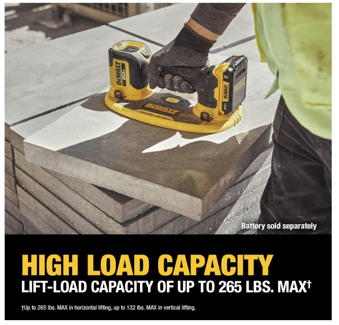 Grip and lift construction materials with the GRABO 20V MAX* Lift. With a lifting capacity of up to 120 kg MAX†, this lift uses a powerful electric vacuum pump to lift a wide range of heavy construction materials, including glass, tile, and metal, as well as semi-porous materials like wood, drywall, concrete, and natural stone. This product features a built-in pressure sensor that automatically controls the pump and maintains the vacuum grip. Featuring a digital pressure gauge, audible alarm, and dual-action button, the GRABO 20V MAX* Lift maximizes user control during lifting, transporting, or installation operations. Powered by a 20V MAX* battery, this tool offers generous runtime for long workdays.
