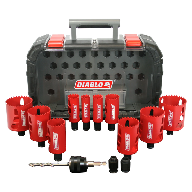 The Diablo 14-Piece Hole Saw Kit includes 10 bi-metal cups, 1 Snap-Lock Plus™ mandrel, 1 pilot drill bit, and 2 adapter nuts (1/2" and 5/8") for quick and easy cup changes and optimal performance. This new high-performance hole saw set delivers faster cutting and increased productivity compared to standard bi-metal hole saws. Unlike any other product on the market, Diablo hole saws and their Snap-Lock Plus™ mandrel system simplify the fastening process for fast and efficient assembly.