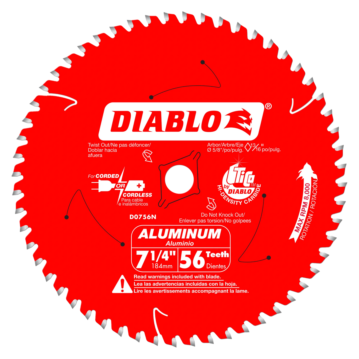 Diablo Thick Aluminum Saw Blades are optimized for cutting thin (up to 1/8"), medium (3/32"-1/4"), and thick (3/16"-7/16") aluminum. Featuring Diablo's new, specially formulated high-performance TiCo™ Super-Density Micro-Grain Carbide, these radical blades resist shock, reduce wear, deliver clog-free cuts, and outlast standard carbide for metal cutting. The specially formulated metal-cutting carbide teeth feature a Triple Ground (TCG) design for clean, burr-free finishes, virtually eliminating rework. Shock-resistant Tri-Metal Brazing allows these aluminum blades to cut through metal materials while resisting extreme shock for maximum durability. The Diablo line of aluminum saw blades is ideal for corded and cordless saws for field cutting of non-ferrous metals such as aluminum extrusions, copper tubing, brass plates, etc.