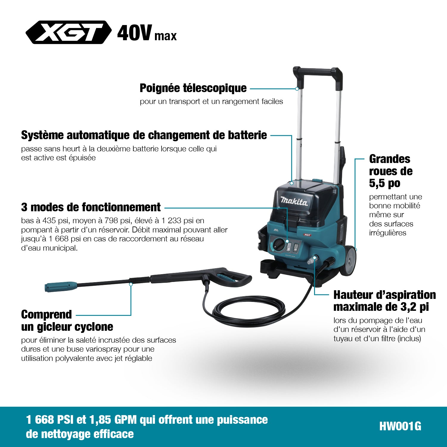 • PUISSANCE : 3 modes de fonctionnement - faible 435 psi, moyen 798 psi, élevé 1 233 psi lorsqu'il est pompé à partir d'un réservoir avec un débit maximal jusqu'à 1 668 psi lorsqu'il est connecté à l'alimentation en eau de la ville.