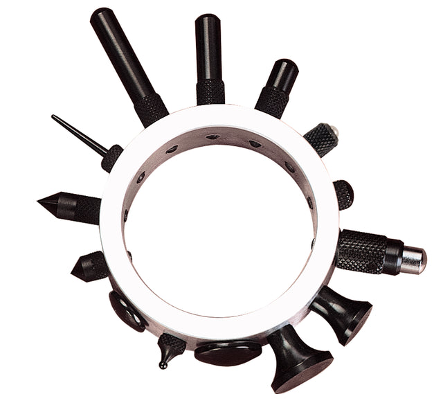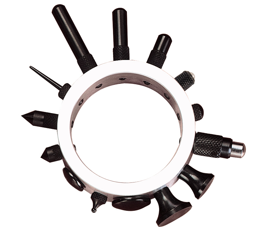 Le jeu de pointes de contact Starrett comprend : 14 pointes avec filetage n° 4-48 pour indicateurs AGD ; une pointe standard de 6,3 mm (1/4 po) de long ; 9 pointes de forme spéciale ; une enclume amortisseur de chocs de 28 mm ; et 3 pointes extra longues de 13, 19 et 25 mm (1/2 po, 3/4 po et 1 po). Ce jeu est en acier haute qualité, trempé et rectifié. Toutes les pointes sont montées sur une bague en aluminium pratique pour une fixation sûre et une sélection facile. Jeu de pointes de contact.