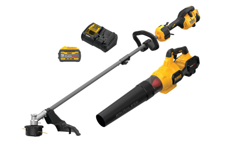 Tackle tough yard jobs and delicate outdoor tasks with the 60V MAX* Brushless 17-in. Accessory Attachment String Trimmer and Blower Combo. The universal attachment allows you to attach additional accessories and convert the 60V MAX* String Trimmer to other outdoor tools. The DEWALT FLEXVOLT® 60V MAX* Handheld Axial Blower's speed control trigger and speed lock give it controlled power while producing up to 600 CFM of air at a top speed of 125 mph to tackle stuck and stubborn debris. Both tools feature a high-efficiency brushless motor that maximizes runtime and life while still supporting regular heavy-duty use. Compatible with all DEWALT 20V MAX* tools, this combo also includes a 9.0 Ah FLEXVOLT 60V MAX* battery and charger.