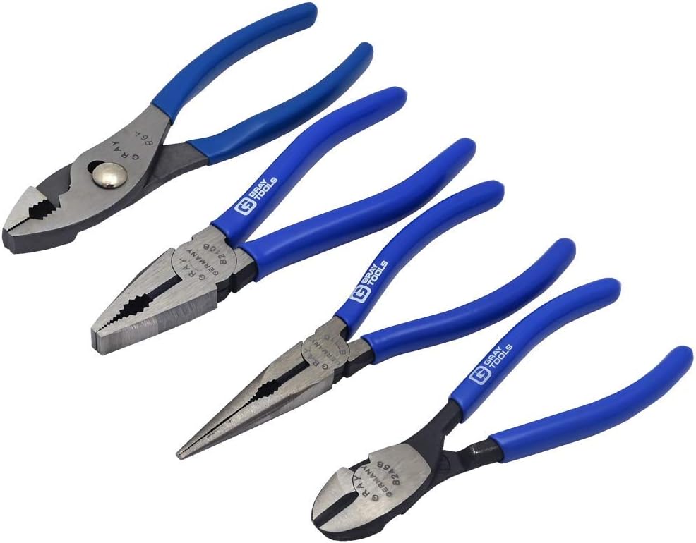 - Contains: a 6-1/4-inch lineman's pliers, a 6-1/2-inch needle-nose pliers with wire cutters, a 5-1/2-inch side-cutting pliers, and a 6-3/4-inch slip joint pliers