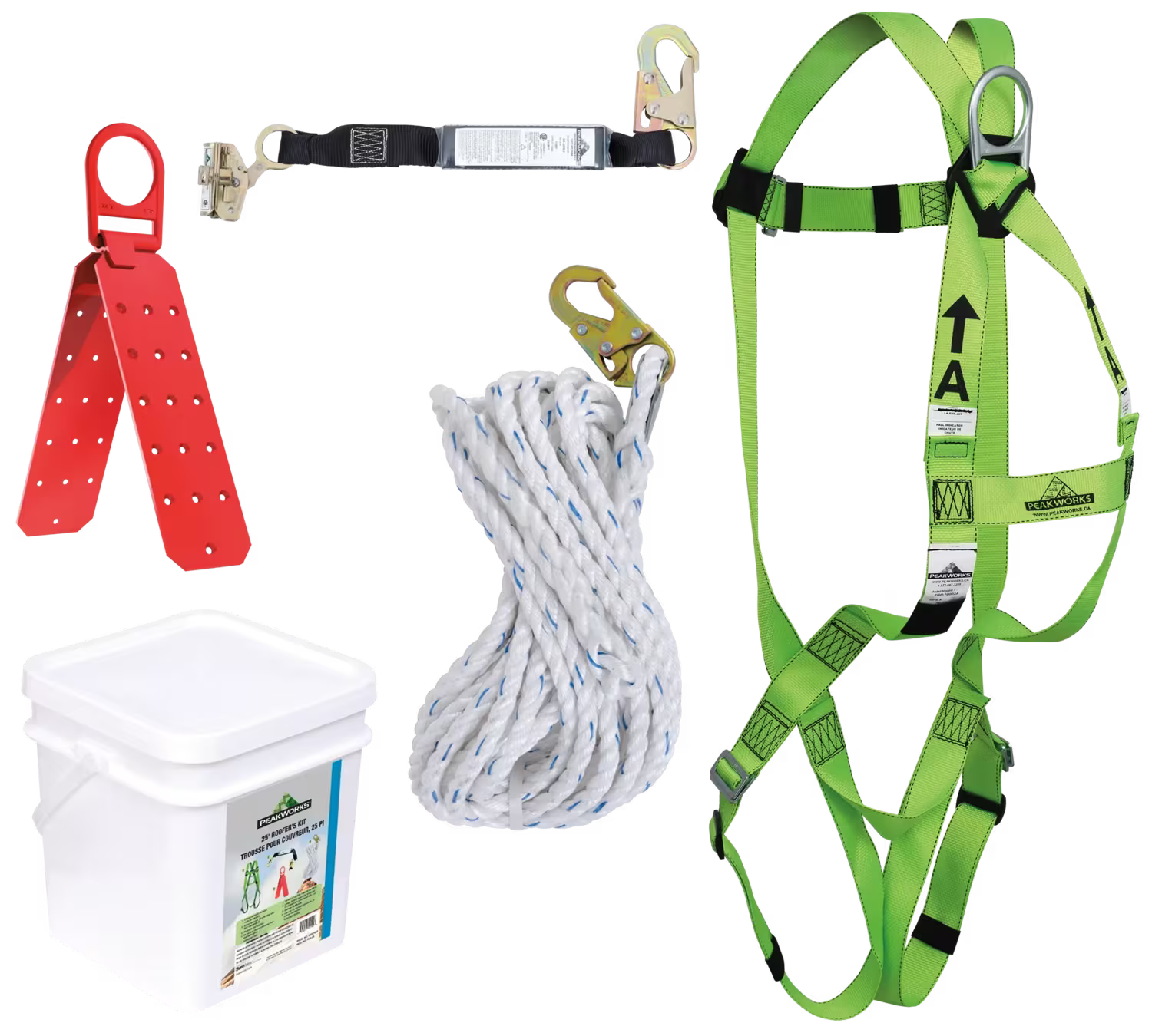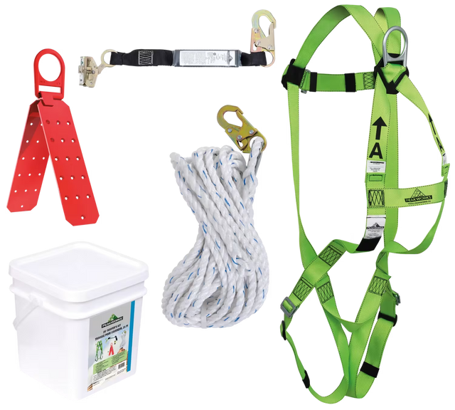 - Includes V8001000 Compliance Harness, V8103162 SP Lanyard with Integrated ADP Safety Rope Grab, V840184025 Vertical Lifeline, V8229100 Reusable Roof Rack, V860210 Bucket