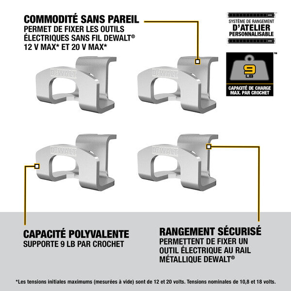 Le lot de 4 crochets de suspension pour outils sans fil fait partie du système de rangement d’atelier DEWALT et se monte sur le rail métallique DEWALT. Les crochets permettent de fixer facilement les outils électriques sans fil DEWALT 12 V MAX* et 20 V MAX* qui ne comportent pas déjà un crochet. Ils sont faits d’acier robuste et peuvent supporter 9 lb. chacun. Ils permettent de fixer solidement les outils électriques DEWALT au rail métallique DEWALT.